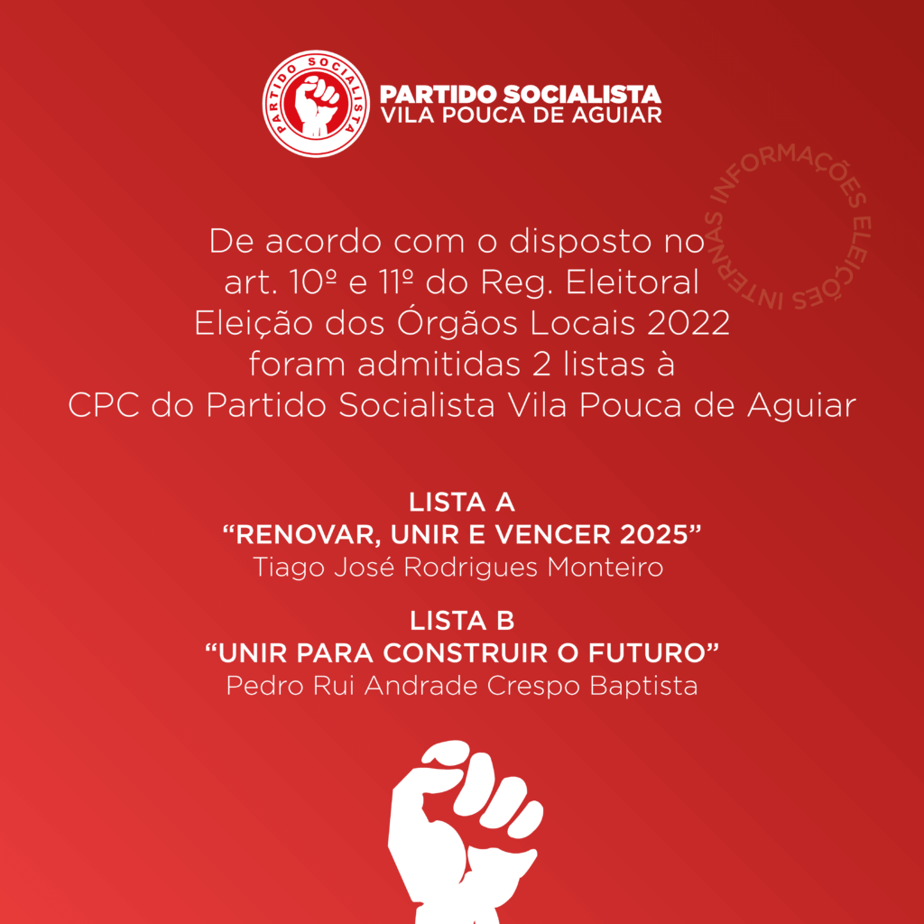 Após prazo de entrega de listas candidatas a Comissão Política Concelhia do Partido Socialista de Vila Pouca de Aguiar, foram apresentadas 2 listas candidatas, sendo elas: