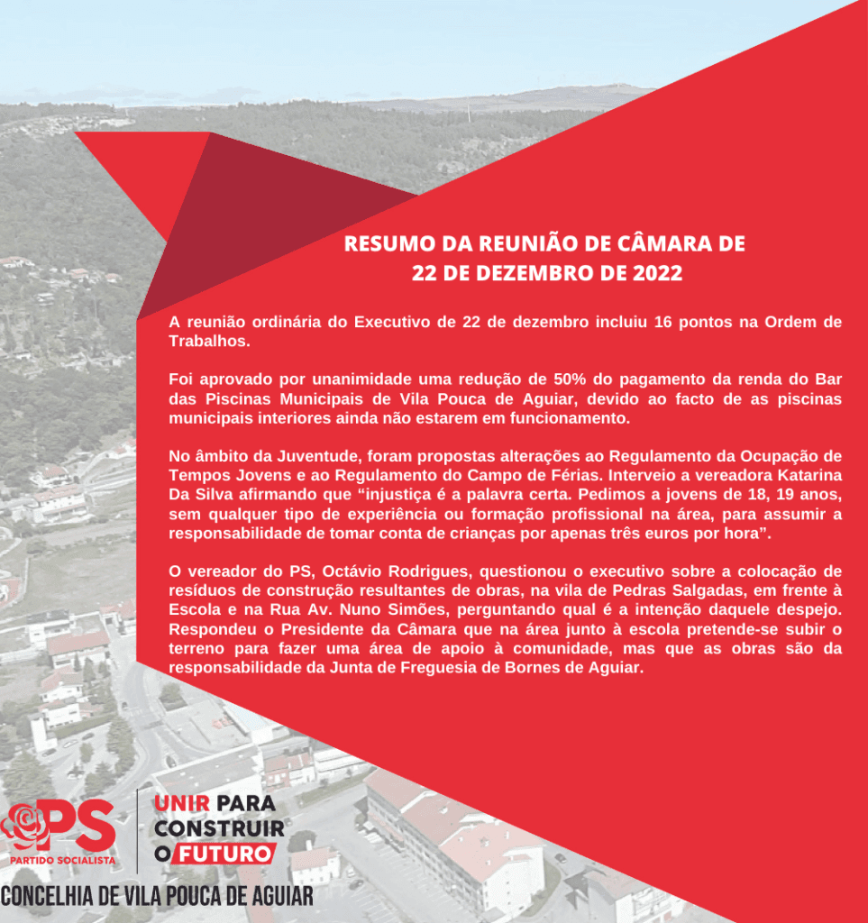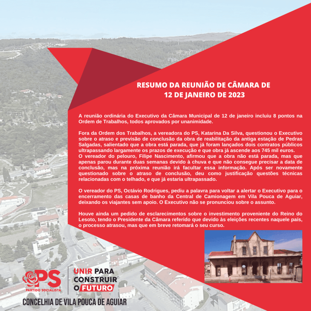 A reunião ordinária do dia 23 de março incluiu 7 pontos na Ordem de Trabalhos (OT), tendo iniciado com a aprovação por unanimidade da ata da reunião ordinária de 9 de março de 2023. O segundo ponto na OT prendeu-se com um contrato de prestação de serviços para fiscalização de empreitadas de obras públicas, tendo o vereador Luís Filipe Nascimento explicado que a técnica em causa já acompanha as obras que lhe estão a ser atribuídas no novo contrato. Interveio o vereador do PS, Octávio Rodrigues, para questionar se não há profissionais no Município que possam executar estas tarefas, tendo o mesmo vereador do PSD explicado que os dois engenheiros da sua divisão acompanham, de momento, 45 empreitadas. O vereador do PS questionou então porque estariam a ser atribuídas obras que estão, de momento, completamente paradas tal como no Cineteatro, tendo o vereador do PSD respondido que essas obras irão necessitar, eventualmente, de fiscalização. A vereadora do Partido Socialista, Katarina Da Silva, também pediu a palavra para questionar o Município sobre a extinção do projeto, tendo o vereador Luís Filipe Nascimento dito que se verificou a necessidade de reformular o projeto do sistema de áudio, luz e imagem. Relativamente à extinção dos dois contratos associados à obra do Cineteatro, a vereadora do PS questionou se o processo não implica compensações financeiras às empresas em causa, tendo o vereador do PSD dito que não se preveem indemnizações. A proposta para o contrato de prestação de serviços foi aprovada por unanimidade. Depois, foram deliberadas a constituição da Comissão de Vistorias e ainda a alteração da delimitação da área de reabilitação urbana de Viduedo, ambas aprovadas por unanimidade. O ponto seguinte prendeu-se com a adenda ao protocolo com o Centro Social Comunitário do Planalto de Jales, onde se pretendeu incluir a valência de ERPI (também designado Lar de Idosos). Interveio a vereadora do PS, Katarina Da Silva, questionando se a adenda tem efeitos retroativos, uma vez que a referida instituição possui a ERPI há mais tempo, tendo a vereadora do Pelouro, Manuela Castanheira, respondido que não, ao qual a vereadora do PS respondeu “que pena”. A vereadora do Pelouro assentiu. A proposta foi aprovada por unanimidade. Ainda no âmbito da ação social, foi aprovado por unanimidade um protocolo de colaboração entre a Câmara Municipal e o Conselho Diretivo do Baldio de Parada de Aguiar, para a prestação de serviços da primeira para a segunda no domínio da nutrição e elaboração de ementas. Por fim, foi proposta a atribuição de subsídios no âmbito da ação social escolar, aprovada por unanimidade. Finda a Ordem de Trabalhos, o Presidente da Câmara tomou da palavra para se referir a um artigo publicado na Voz de Trás-os-Montes sobre a abertura da unidade de convalescença e à informação na contracapa, onde o próprio jornal indicava que contactou o próprio (Presidente) mas que o mesmo recusou uma vez que “não comentava assuntos de partidos políticos”. Explicou então que aquilo que disse na realidade foi que aquele assunto não era uma questão partidária, tendo de seguida lido uma declaração redigida pelo próprio sobre a abertura da Unidade de Convalescença e o artigo em causa, que virá refletida na ata da reunião de 23 de março. Terminou dizendo que queria agradecer formalmente a todas as pessoas envolvidas no processo, tendo ainda destacado a importância do abaixo assinado promovido pela comunidade local pelo não encerramento da Unidade de Paliativos. O vereador do Partido Socialista, Octávio Rodrigues, pediu a palavra para, em nome da vereação do PS, expressar a sua satisfação pelo resultado final e a confirmação da instalação da Unidade de Convalescença. O vereador do Partido Socialista pediu então a palavra para questionar o Executivo sobre o encerramento das Piscinas Municipais, que já estão fechadas poucos dias após abrir. O vereador Luís Filipe Nascimento disse que a análise às águas indicou a presença de coliformes e que neste momento só estavam a aguardar a confirmação do resultado de novas análises, por parte do Delegado de Saúde, para avançar com a reabertura. O vereador do PS pediu novamente a palavra para se referir ao Cemitério de Vila Pouca de Aguiar, uma vez que saiu uma notícia na imprensa regional onde confirma a construção de um Crematório no local. Questionou então o Executivo se esta construção estava realmente confirmada. O Presidente da Câmara disse que não, que apenas foi conversado em reunião com a CIM Alto-Tâmega e Barroso, mas que, nessa mesma reunião, não se reuniu um apoio consensual sobre a possibilidade dessa construção. Explicou ainda que não existe qualquer projeto concluído ou em elaboração pelo Município. O vereador Octávio Rodrigues perguntou então de onde veio a confirmação para a notícia, tendo o Presidente da Câmara suposto que seria pelo conteúdo da reunião com a CIM. Pediu então a palavra a vereadora do PS, Katarina Da Silva, para questionar o Executivo sobre a gestão dos equipamentos do Centro de Saúde, nomeadamente dos veículos, após a transferência de competências. Respondeu a vereadora Manuela Castanheira que essa gestão é clínica, pelo que é feita pelos próprios profissionais do ACES. A vereadora do Partido Socialista alertou que tomou conhecimento de que a prestação de serviços de enfermagem ao domicílio estava a ser condicionada pela indisponibilidade de veículos e, tendo a competência da saúde sido atribuída ao Município, solicitou que a vereadora do pelouro confirmasse a situação. Terminou reforçando a extrema importância da prestação de serviços ao domicílio para territórios como o nosso: disperso, envelhecido e sem rede de transporte em muitas das localidades. A vereadora Manuela Castanheira disse que iria averiguar o problema. A vereadora do PS pe
