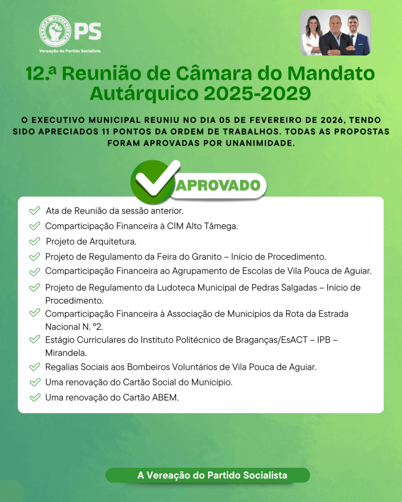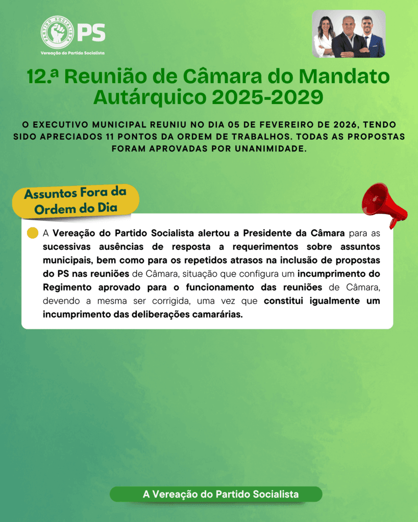 Reunião de Câmara, 05 de fevereiro de 2026By Administrador / Vereação / Leave a Comment Partilha! Facebook Twitter LinkedIn Email