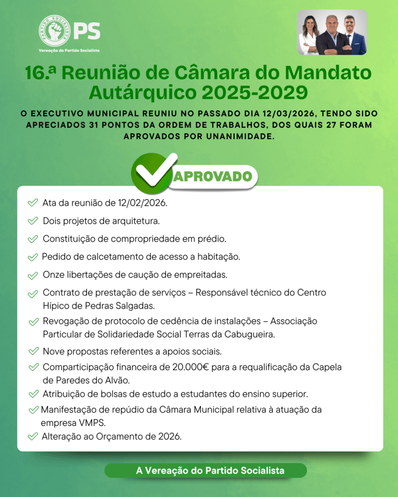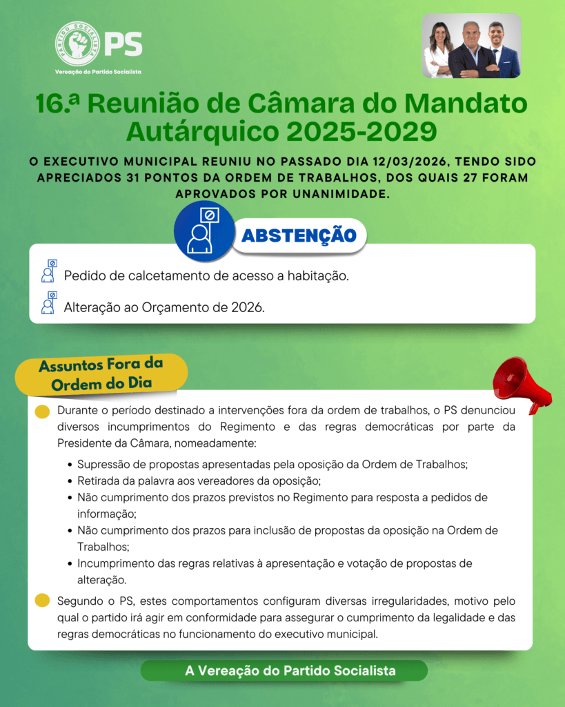 Reunião de Câmara, 12 de março de 2026By Administrador / Vereação / Leave a Comment Partilha! Facebook Twitter LinkedIn Email